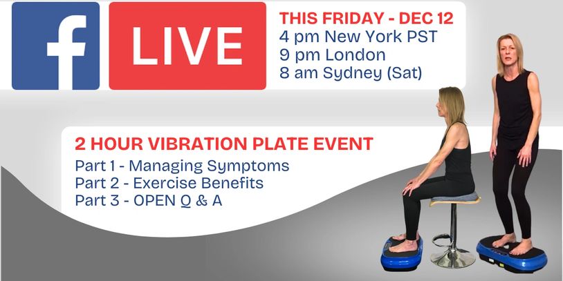 Join Debby LIVE Friday Night for a 2 HOUR vibration plate workshop! Tips on how to use for managing symptoms, fitness benefits and an open Q & A. Go into Facebook and select "going" or "interested" in this event for update or for easy access to the recording later on.